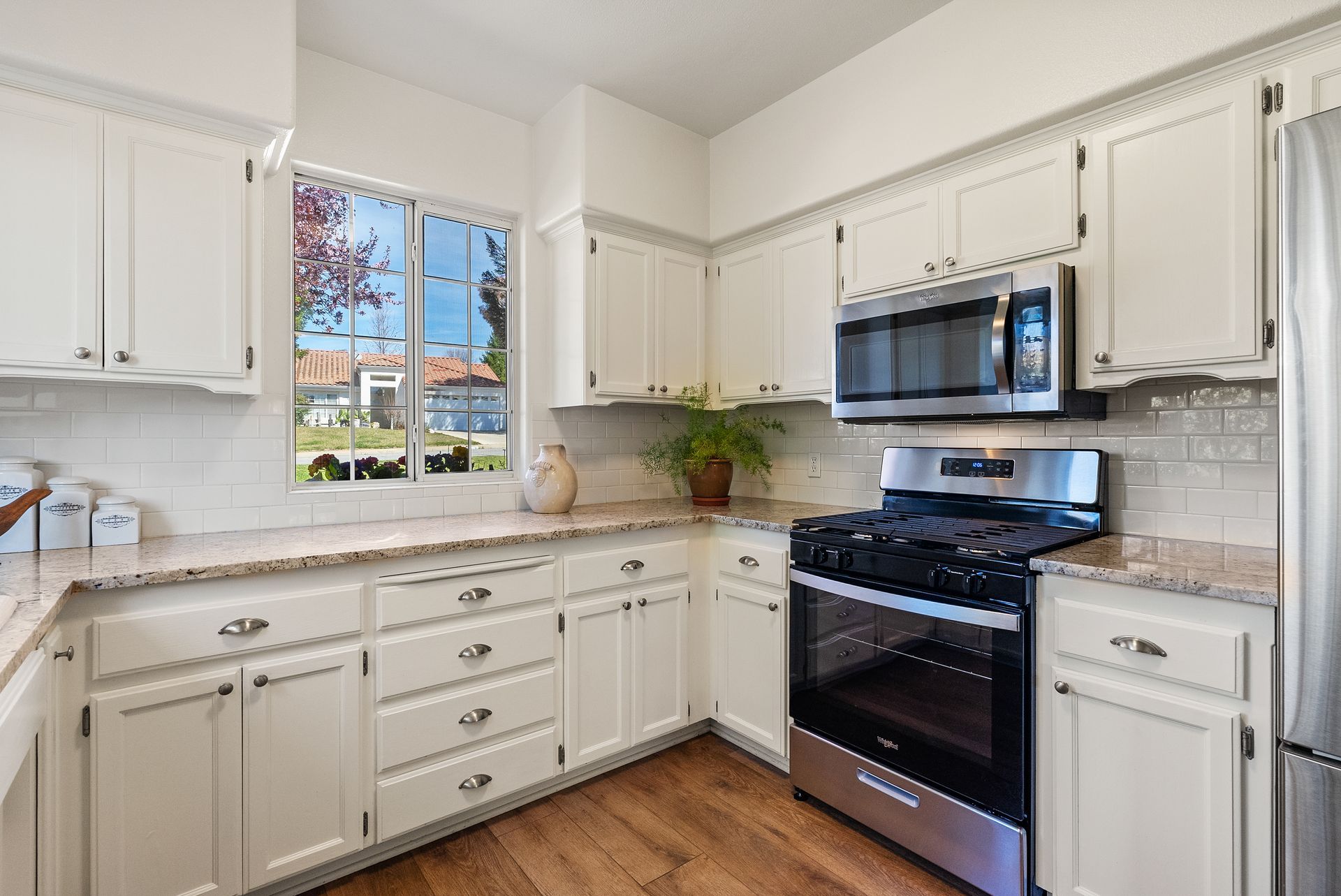 Perfectly situated on a cul-de-sac in the highly coveted Montebello Estates, this meticulously maintained single-level home is move-in ready w/ numerous upgrades. Designed for both elegance and functionality, its open layout creates a warm & inviting atmosphere, seamlessly blending indoor/ outdoor living—ideal for the iconic California lifestyle.The spacious great room features a cozy gas fireplace & abundant natural light from a sliding glass door leading to the backyard. Step onto the covered patio, perfect for entertaining or private time w/ a morning latte or evening glass of wine while admiring the breathtaking coastal hills. Vaulted ceilings enhance the sense of space, while newly installed (2025) textured carpeting w/ plush padding adds comfort to the bedrooms. A chef’s delight, the granite-adorned kitchen is bathed in natural light and boasts white cabinetry w/ sleek metal hardware, stainless steel appliances—including a new Whirlpool range (2025), French-door Samsung refrigerator, Whirlpool dishwasher & microwave—plus a deep single-bowl sink w/ a stainless steel faucet. Expansive counter space makes meal prep a breeze, while beautiful extra wide vinyl plank flooring flows throughout the main living areas. A private hallway leads to all bedrooms, including the serene primary suite w/ a spacious vanity, a remodeled glass-enclosed tile walk-in shower, generous closet, & vaulted ceiling. Two additional bedrooms and a full bathroom with a shower-over-tub offer flexible living space, including room for a home office or a study. Additional features include a new air conditioner (2024); a new roof (2023), thoughtfully preserving the original Spanish tiles, now showcasing a gentle patina; ceiling fans; window shutters; an indoor laundry room; and an attached 2-car finished garage with built-in cabinets, all of which add extra peace of mind and value. The exterior has been beautifully enhanced with freshly installed bark, drought-resistant plants, and custom pavers, offering both aesthetic appeal and low-maintenance ease. Ideally located just minutes from historic downtown Paso Robles, this home offers easy access to charming boutiques, renowned tasting rooms, and an array of exceptional dining options, including Michelin-recognized restaurants. With vibrant annual events and a rich local culture, this sought-after region is truly a premier destination. Don’t miss out—schedule your showing today and make this Central Coast Wine Country gem your new home!