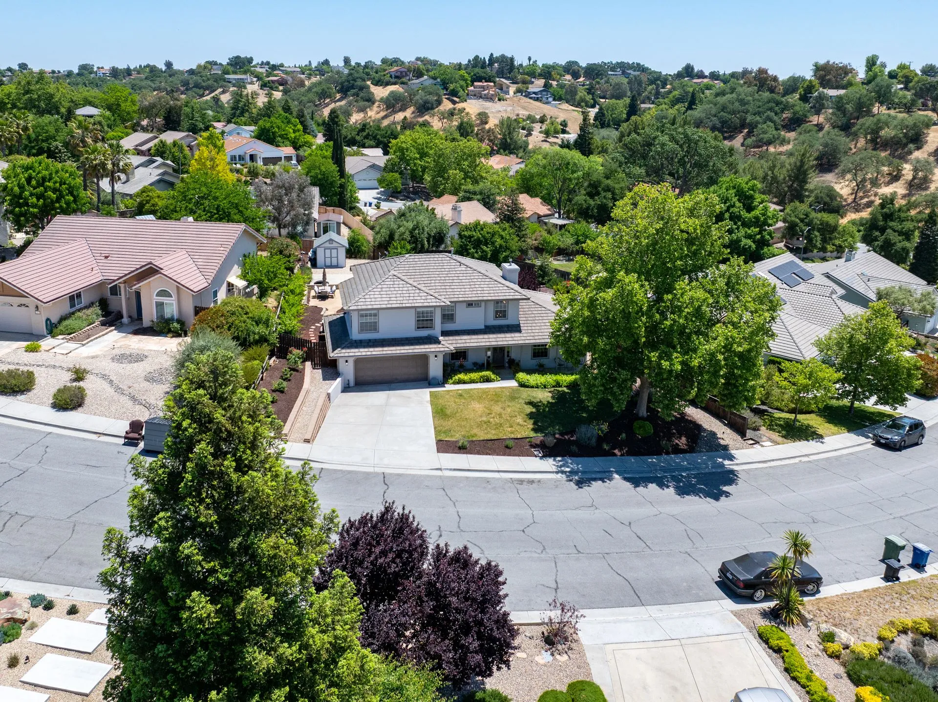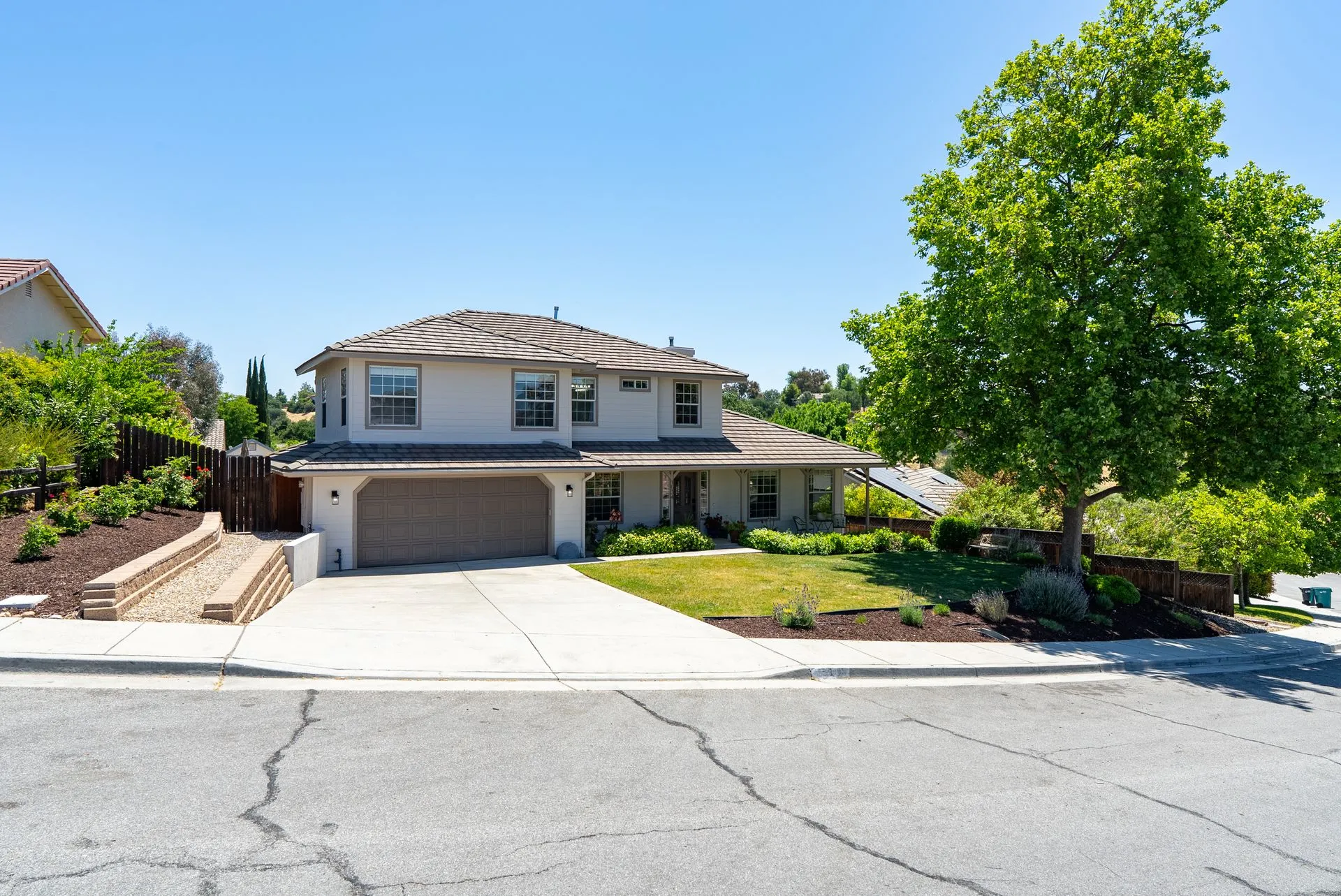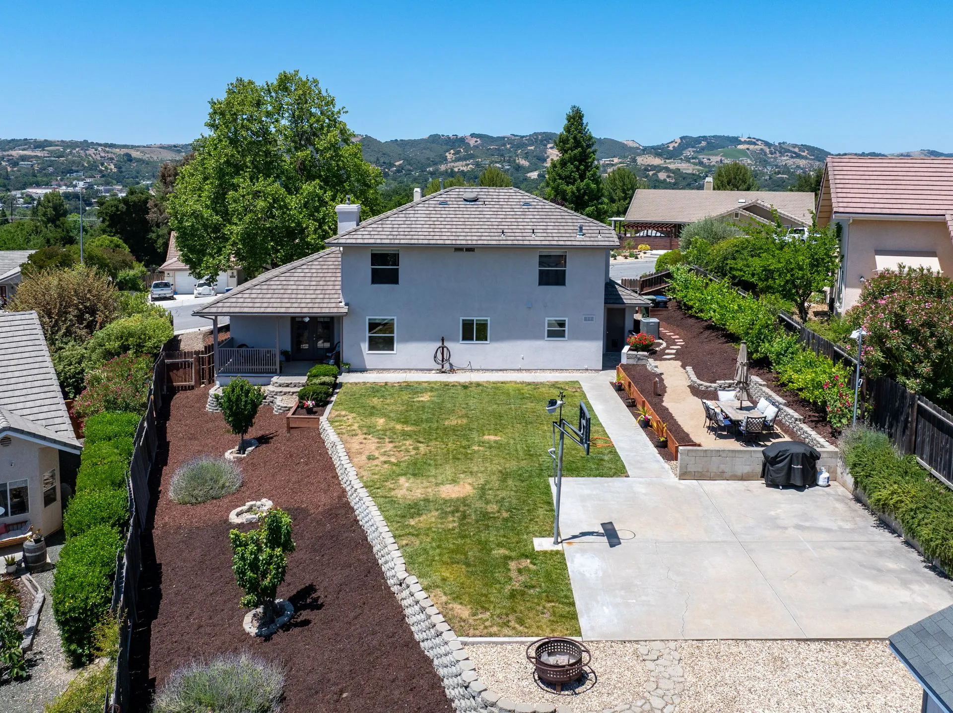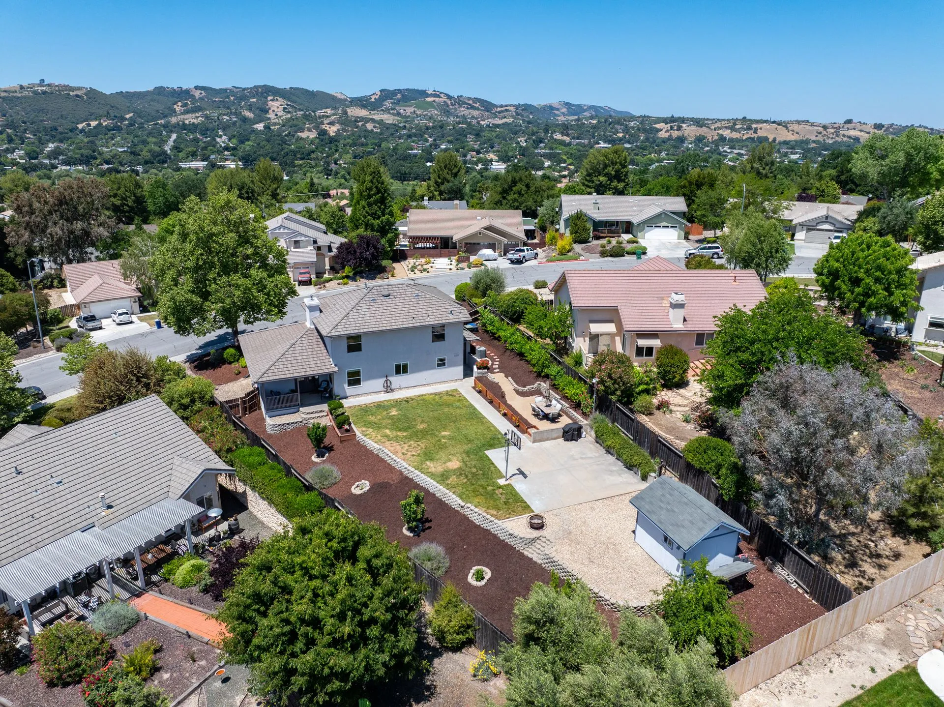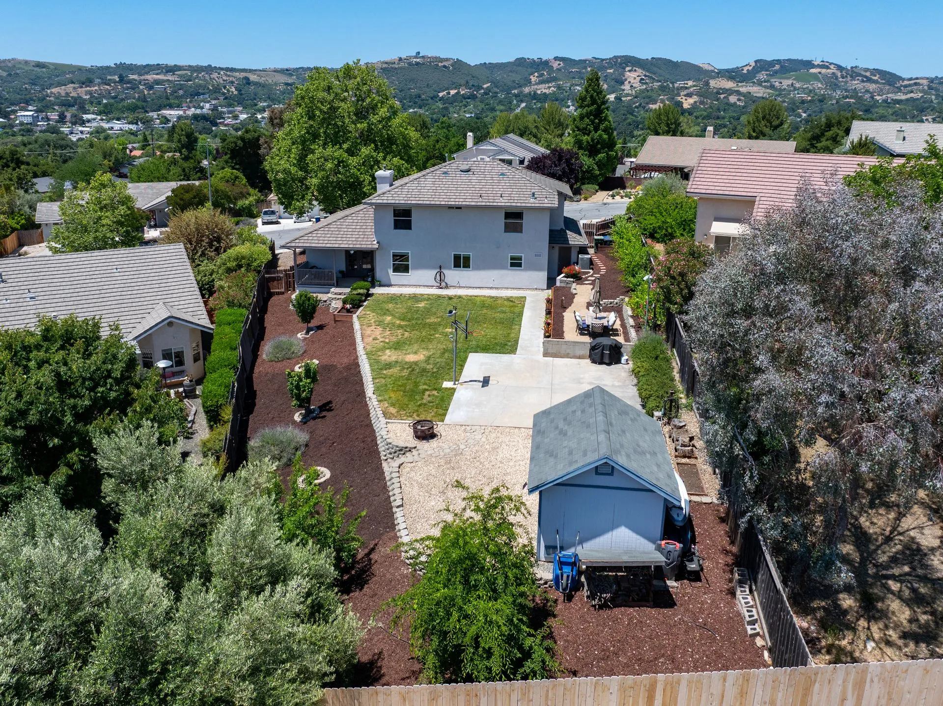 This truly is THE ONE for which you’ve been waiting! Move-in ready & nestled in one of Paso Robles’ most desirable neighborhoods, this beautiful residence offers an indoor/outdoor flow, comfort & stunning views of the rolling coastal hills from every room. A welcoming covered front porch sets the tone, inviting you into the formal entryway & a spacious, light-filled living room which easily flows out to the appreciably sized backyard (almost 1/3 of an acre). The covered rear patio creates an ideal space for relaxing while enjoying the serene surroundings. The heart of the home is the stunning chef’s kitchen, thoughtfully remodeled with luxurious finishes. Highlights include custom granite countertops sourced from Brazil, designer subway tile backsplash, a walk-in pantry, stainless steel appliances including a 5-burner gas range, French-door refrigerator, built-in microwave, dishwasher & farm-style sink. A large center island w/ breakfast bar offers ample space for entertaining, including a built-in wine fridge. Adjacent to the kitchen is a generously sized granite trimmed laundry room w/ a sink & powder room. Just off the entryway, a spacious study features custom built-ins; this space can easily serve as a home office & guest space. Upstairs are 3 spacious bedrooms, including a serene primary suite w/ treetop views, a light & bright ensuite bathroom with dual sinks. The additional bedrooms are well-sized & the updated hall bathroom features a modern vanity. Additional features include luxury vinyl flooring, Simplisafe camera/doorbell, custom hardware, USB outlets, adding style & function. The backyard is a true standout, featuring 10 grapevines of several varietals, along w/ cherry, plum & pear trees that produce delicious fruit – perfect for sharing, making jam, enjoying Paso’s summer harvest. Outdoor living is enhanced w/ multiple entertaining spaces including covered front & back porches, an elevated patio w/ expansive views, where you can actually watch launches from Vandenberg Space Force Base, a basketball/game court & storage shed. The attached two-car garage includes a new garage door opener & additional built-in storage. This light-filled home blends tasteful updates, thoughtful design & natural beauty – making it a rare and exceptional opportunity. Rounding out this offering is the close proximity to the iconic downtown Paso Robles w/ its myriad of wine bars, restaurants, boutiques, cafes, & renowned annual events. Welcome home!