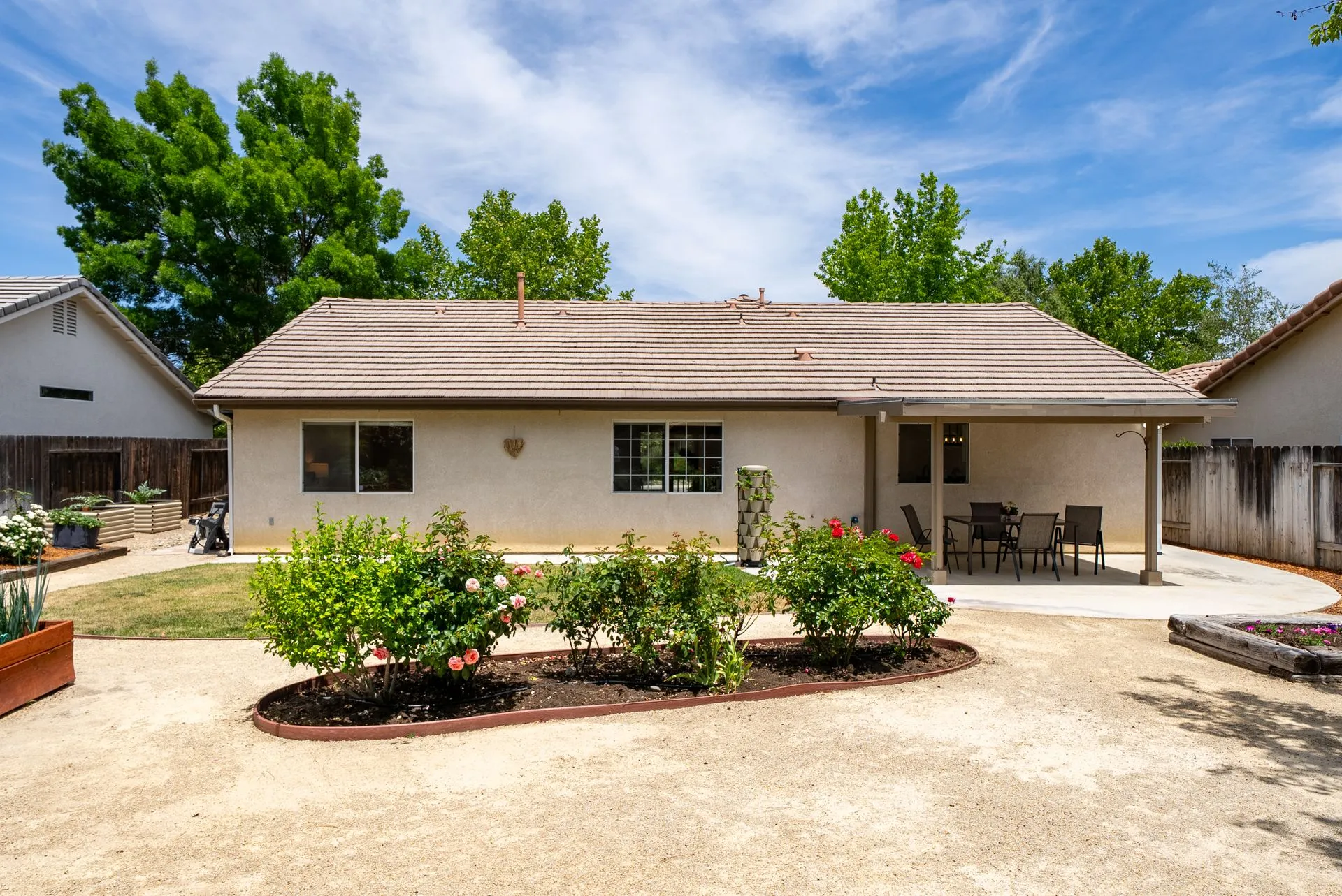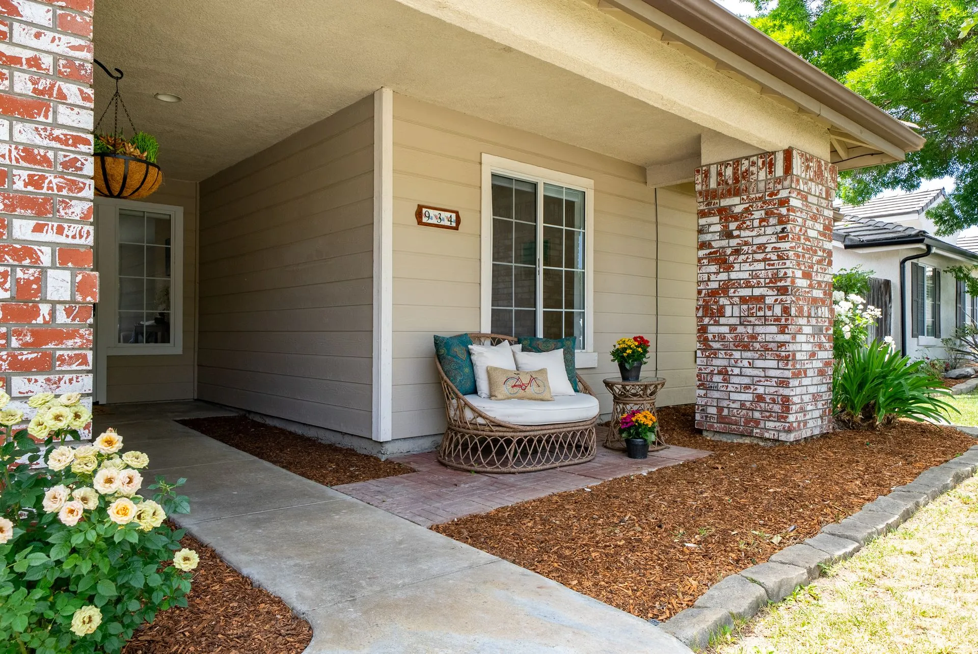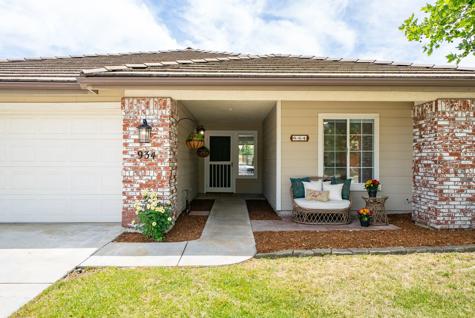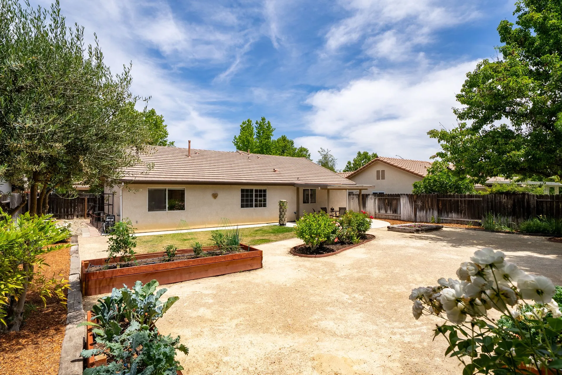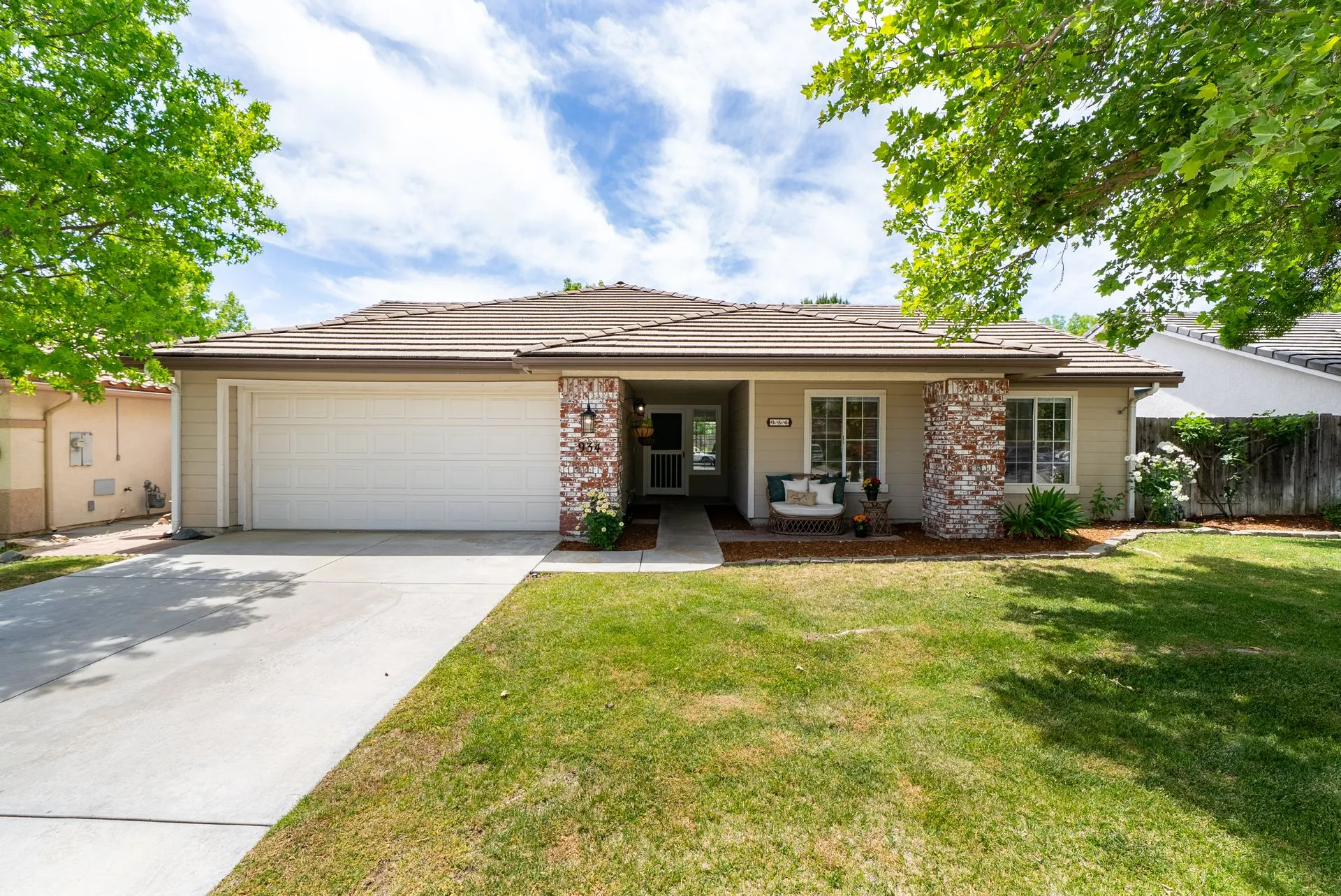 Welcome to 934 Sycamore Canyon Road—your dream home in the heart of Paso Robles Wine Country. This move-in ready, pristine, single-level residence has been thoughtfully updated w/ modern touches & stylish finishes throughout. Offering three spacious bedrooms & two bathrooms, the home is filled w/ natural light & offers an exceptional open flow, tied together by stunning tile floors. The private primary suite feels like a retreat, complete w/ mirrored closet doors & a beautifully updated ensuite bathroom featuring a dual-sink Super White Dolomite stone vanity, a glass-enclosed shower & separate water closet. The additional bedrooms are generously sized & the second bathroom has also been tastefully updated. The eat-in kitchen is a standout with elegant Super White Dolomite stone countertops & backsplash, refined white cabinetry w/ black hardware, recessed lighting & stainless steel appliances—including a French door refrigerator, gas range, microwave/air fryer & dishwasher. Completing the space is a view window above the sink & RO system connected to both the sink and fridge. A sliding glass door provides seamless flow from the kitchen to the private backyard w/ covered patio & raised garden beds full of fresh herbs, kale, berries & more. The separate laundry room includes a newer washer and dryer & leads into the two-car garage, which features a Tesla EV charger, an extra refrigerator, updated smart garage door opener, and room for additional storage. Throughout the home, recent upgrades include designer lighting, ceiling fans, 4” baseboards, updated light switches/power outlets, and interior door hardware. Smart home features include a Nest thermostat & smoke detectors; SimpliSafe entry lock and notification system; a smart air filter in the primary bath; and a smart watering controller for the yard. An owned Hague water filtration and RO system—installed in July 2024—ensures top-tier water quality throughout the home. Outdoors, enjoy a shaded front porch, a covered back patio, beautiful rose bushes, and multiple inviting spaces for relaxing or entertaining. Located in the highly sought-after Meadowlark neighborhood, this tranquil setting offers a peaceful lifestyle just minutes from downtown Paso Robles, award-winning wineries, and within easy reach of San Luis Obispo, scenic hiking trails, and Central Coast beaches. This beautifully updated home is ready for you to move in and enjoy—whether for entertaining guests or enjoying quiet moments at home.