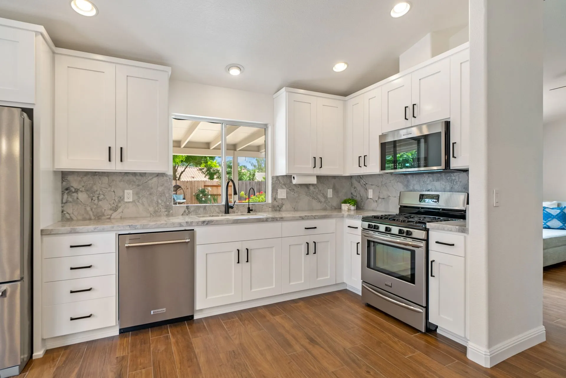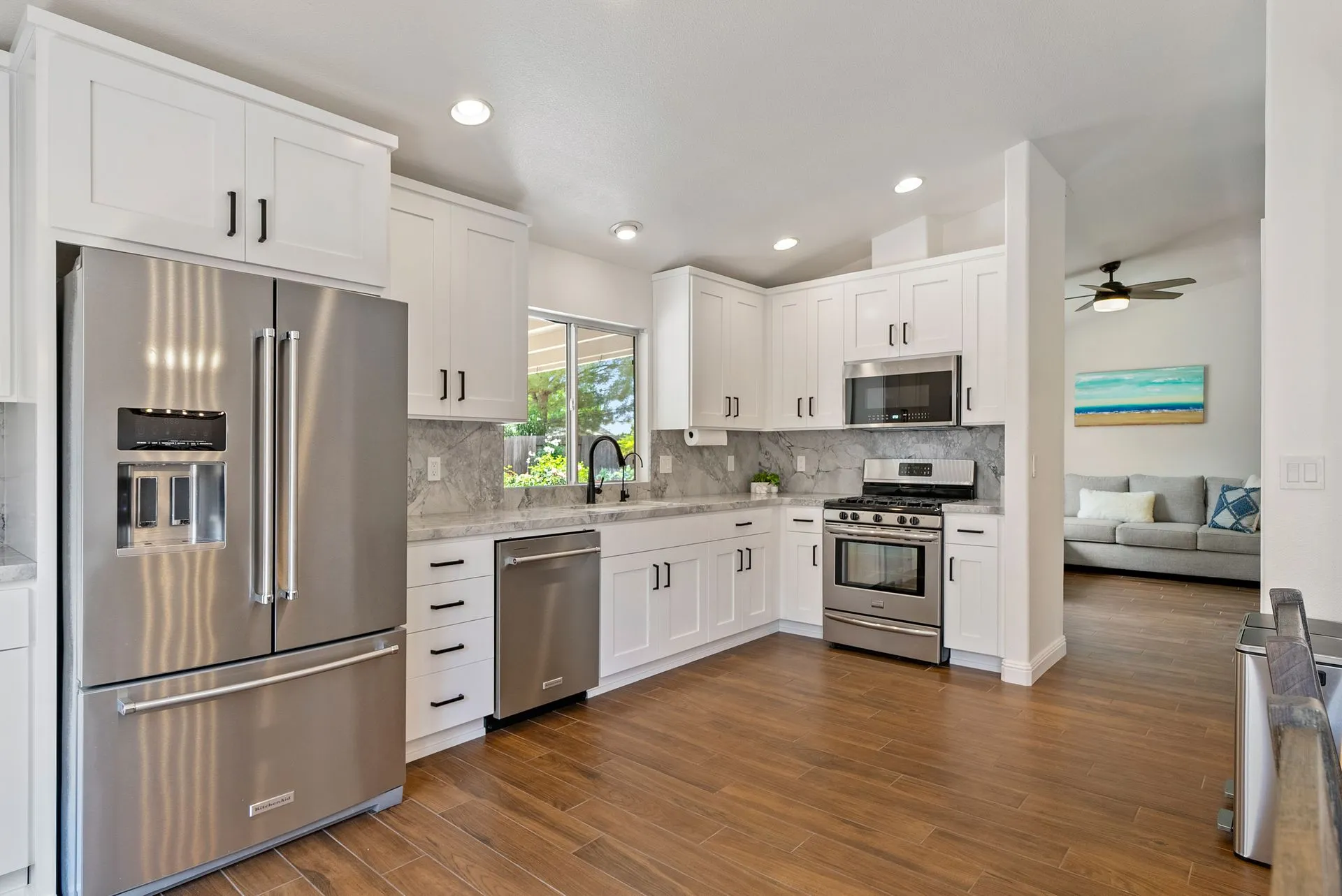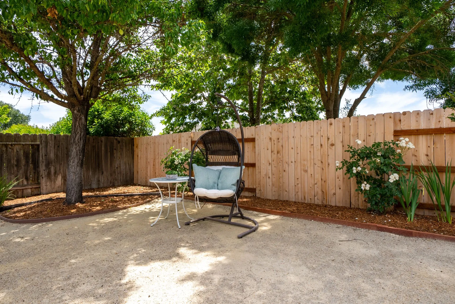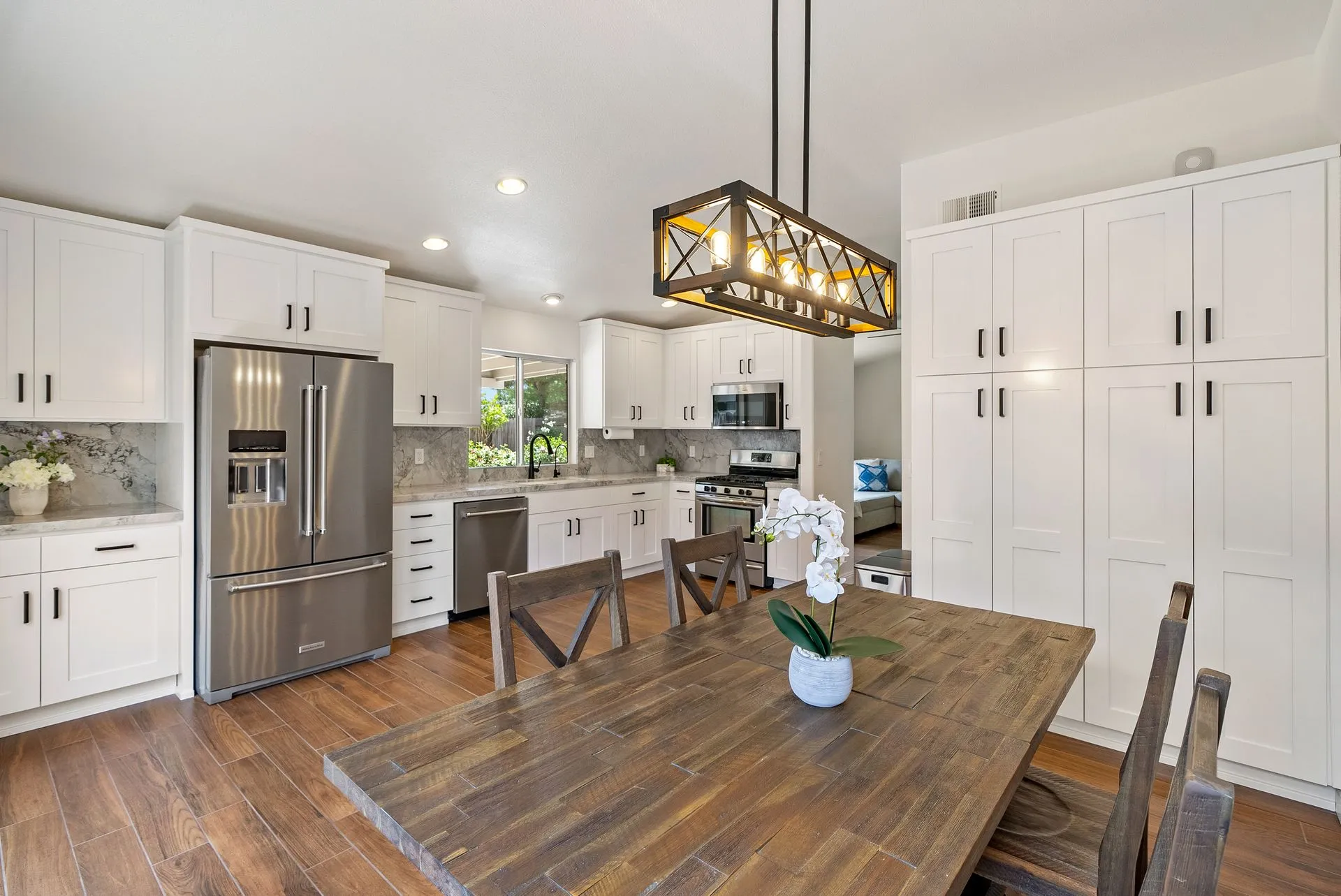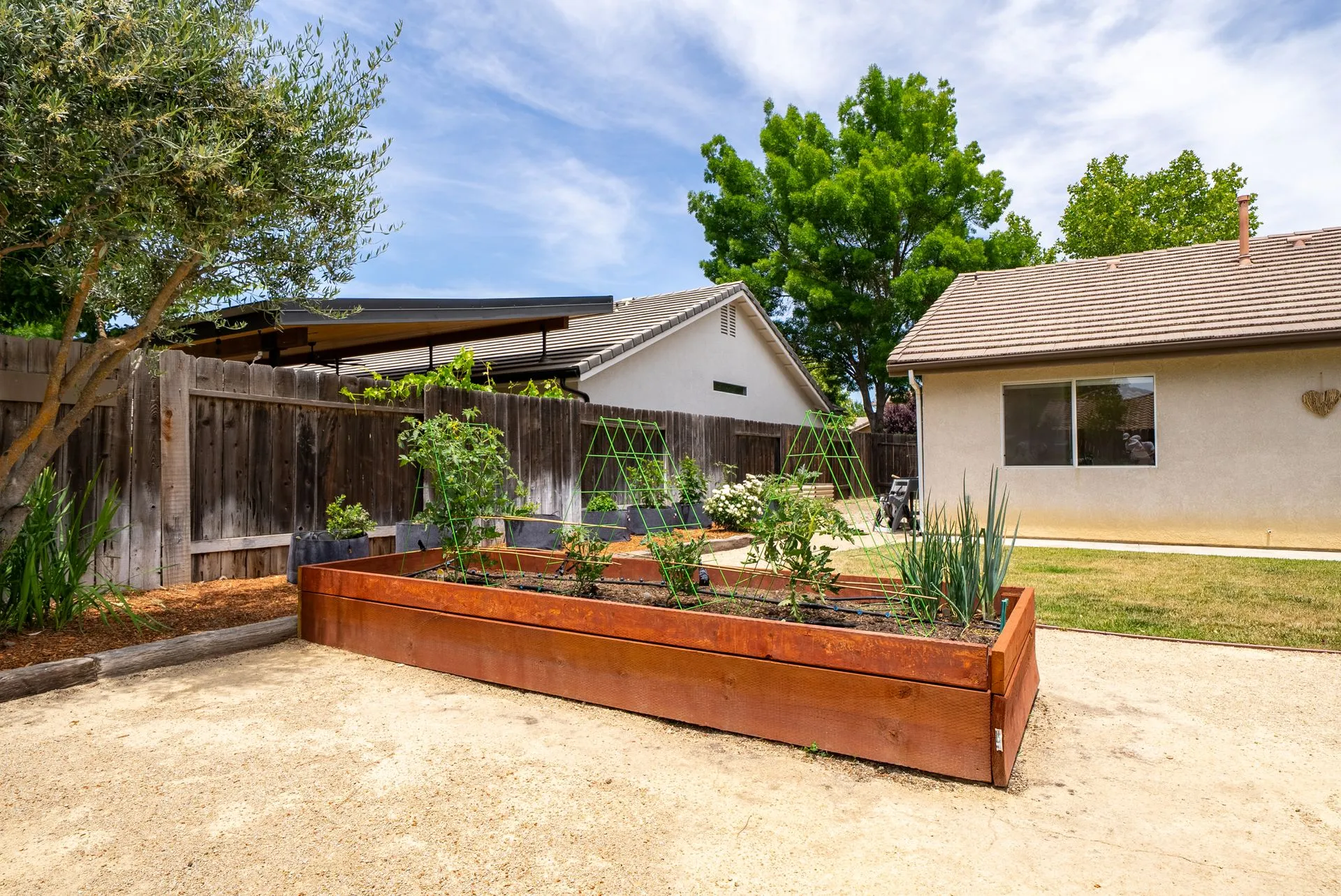 Welcome to 934 Sycamore Canyon Road—your dream home in the heart of Paso Robles Wine Country. This move-in ready, pristine, single-level residence has been thoughtfully updated w/ modern touches & stylish finishes throughout. Offering three spacious bedrooms & two bathrooms, the home is filled w/ natural light & offers an exceptional open flow, tied together by stunning tile floors. The private primary suite feels like a retreat, complete w/ mirrored closet doors & a beautifully updated ensuite bathroom featuring a dual-sink Super White Dolomite stone vanity, a glass-enclosed shower & separate water closet. The additional bedrooms are generously sized & the second bathroom has also been tastefully updated. The eat-in kitchen is a standout with elegant Super White Dolomite stone countertops & backsplash, refined white cabinetry w/ black hardware, recessed lighting & stainless steel appliances—including a French door refrigerator, gas range, microwave/air fryer & dishwasher. Completing the space is a view window above the sink & RO system connected to both the sink and fridge. A sliding glass door provides seamless flow from the kitchen to the private backyard w/ covered patio & raised garden beds full of fresh herbs, kale, berries & more. The separate laundry room includes a newer washer and dryer & leads into the two-car garage, which features a Tesla EV charger, an extra refrigerator, updated smart garage door opener, and room for additional storage. Throughout the home, recent upgrades include designer lighting, ceiling fans, 4” baseboards, updated light switches/power outlets, and interior door hardware. Smart home features include a Nest thermostat & smoke detectors; SimpliSafe entry lock and notification system; a smart air filter in the primary bath; and a smart watering controller for the yard. An owned Hague water filtration and RO system—installed in July 2024—ensures top-tier water quality throughout the home. Outdoors, enjoy a shaded front porch, a covered back patio, beautiful rose bushes, and multiple inviting spaces for relaxing or entertaining. Located in the highly sought-after Meadowlark neighborhood, this tranquil setting offers a peaceful lifestyle just minutes from downtown Paso Robles, award-winning wineries, and within easy reach of San Luis Obispo, scenic hiking trails, and Central Coast beaches. This beautifully updated home is ready for you to move in and enjoy—whether for entertaining guests or enjoying quiet moments at home.